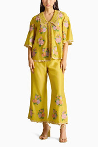 Featuring yellow chanderi floral bunch mosaic threadwork, beadwork shirt with cutwork detail collar paired with yellow chanderi floral bunch mosaic threadwork and beadwork pants.