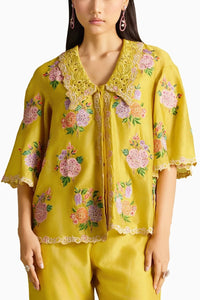 Featuring yellow chanderi floral bunch mosaic threadwork, beadwork shirt with cutwork detail collar.