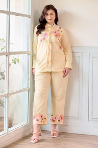 Brighten your wardrobe with this yellow floral co-ord set featuring a Chinese-collared shirt with front drawstrings and delicate floral embroidery. Paired with straight-cut pants adorned with embroidered flowers at the hem, this set blends elegance and comfort, making it perfect for daytime outings or festive occasions.