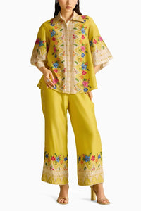 Featuring yellow chanderi floral embroidered chain stitch threadwork and beadwork color block shirt paired with yellow chanderi floral chain stitch threadwork and beadwork color block pants.