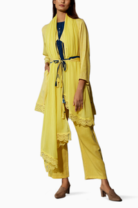 Featuring the Yellow Haldi Festive Set by Jayati Goenka, a radiant ensemble for joyous celebrations. This four-piece set includes an angarakha tie tunic, solid blue sleeveless short top, yellow pants, and dupatta. Adorned with JG signature button knot details and lace hem, crafted from natural dyed and handblock printed cotton blend fabric.