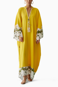Featuring the Yellow Hand-Braided Tassels Kaftan Dress by Nikasha. Infuse your wardrobe with sunshine in a yellow kaftan dress, adorned with hand-braided tassels on the neckline and charming banana tree print detailing on the sleeve and bottom. Crafted from 100% handwoven seersucker cotton, embrace comfort and style in this uniquely designed dress.