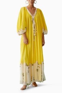 Featuring the Yellow Hand-Braided Tassels Maxi Dress by Nikasha. Embrace sunny days with a yellow maxi dress featuring hand-braided tassels on the neckline and a playful banana tree print frill at the bottom. Crafted from 100% cotton, indulge in comfort and style with this vibrant and chic ensemble.