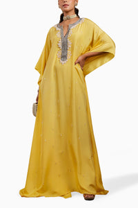 Featuring Yellow Ishya Embellished Kaftan in Habutai Silk. Hand Embellished in Yellow hues. Kaftan has scalloped lace neckline details.