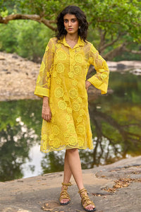 Featuring a fresh lemon yellow organza lace dress in an A-line shape, this piece is adorned with delicate floral mesh and lace embroidery. Designed as a popover dress with a shirt collar and fabric button front placket, it includes cropped sleeves with slits at the edges for added style. Comes with a matching slip for effortless layering.