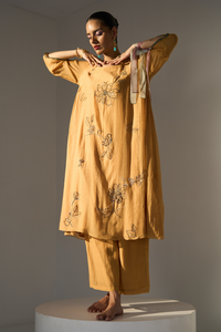 Featuring Yellow Mansa Kurta Set by Sarang Kaur by Mansa Collection. This set adorns Chanderi silk Kurta and pants in a vibrant yellow hue, combining luxurious comfort with timeless elegance, perfect for both casual and formal occasions.