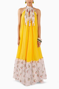 Featuring a refreshing blend of Kota Doria and cotton voil, this Yellow and Cream Chilly Print Maxi Dress from the Chilli collection is finished with a handmade chilly hanging at the neckline, bringing a playful twist to a breezy, elegant silhouette.
