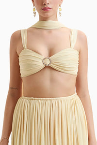 Morgana crop top, intricately crafted from the softest chiffon, features pleating details with a Pearl embellished buckle. Presenting a luxurious feel and elegant drape, this top offers the versatility to transition seamlessly from festive occasions to holidays. Style this piece with your wardrobe staples or the Morgana skirt to complete the set.