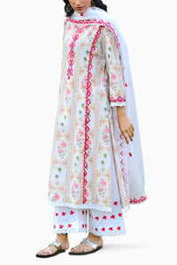Featuring printed yellow lawn kurta, palazzos and dupatta, with resham ari embroidery and crochete lace detailing.