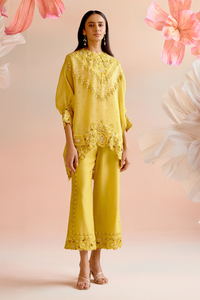 Introducing our stunning yellow silk organza kimono tunic, featuring exquisite multi-tonal cutwork and beadwork that adds a touch of elegance. Paired with matching yellow Chanderi pants, also adorned with multi-tonal cutwork and beadwork, this ensemble creates a harmonious and sophisticated look. Perfect for festive occasions or special gatherings, it combines comfort with style effortlessly.
