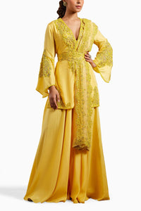 Featuring Yellow Munira Embellished Kurta Set in Habutai Silk. Hand Embellished in Yellow hues. Kurta has a front fastening with bell sleeves and backless with drawstring. Paired with sharara. Styled with embroidered dupatta in Organza, It has an embroidered belt drawstring.
