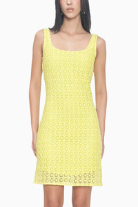 Featuring a sleek silhouette, this sleeveless mini dress is crafted in delicate chemical lace for a modern, textured finish. Designed with a square neckline and a concealed back zip, it offers a clean, seamless fit and is fully lined for added comfort.