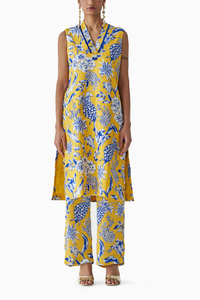 The Yellow Pineapple Kurta & Pants Co-ord crafted from our stunning Vegan silk fabrication, trans-seasonal, is a statement piece. Made in our Yellow Hand Drawn Pineapple print, this has hand embroidered beads hanging from the collar. Featuring a V-neckline, this piece is sleeveless with high slits and can be styled in different ways.It is lined and has small contrast fringe details. Paired with matching trousers with a side zipper. It can be paired with a matching Organza Dupatta. Wear it with heels for an elegant look.