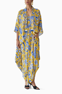 The Yellow Pineapple Strappy Jumpsuit & Cape Co-ord crafted from our stunning Vegan silk fabrication, trans-seasonal, is a statement piece. Made in our Yellow Hand Drawn Pineapple print, this has hand embroidered beads hanging from the collar. Featuring a relaxed Strappy jumpsuit with pockets, this piece asymmetric hem and can be styled in different ways. The cape is free size and has top stitching detailing on the collar. Wear it with heels for an elegant look.
