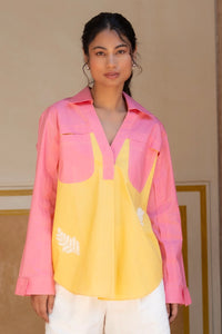 Featuring Yellow Pink Vienna Shirt from URAIB's collection Summer Lovin'. The product is made from 100% cotton poplin highlighing hand embroidered leaves on the shirt with pockets along with intricate back detailing.