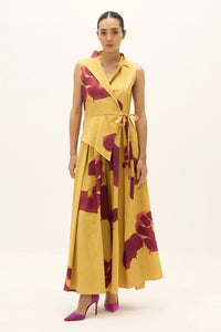 A striking sleeveless wrap-style jumpsuit in soft poplin, featuring a notched lapel collar and tie-up belt that cinches the waist. The flowing wide-leg silhouette gives the illusion of a dress while offering the ease of movement of a jumpsuit. Splashed with bold crimson florals against a warm mustard base, this piece is both sculptural and fluid.