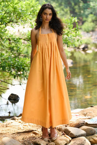 Featuring a vibrant yellow hue in organic cotton poplin, this midi dress showcases mirrored accordion pleat detailing at the center front and a tie-neck halter design. A self-tie knot and elasticated back ensure a comfortable fit, while the silhouette flares gracefully toward the hem for effortless movement.