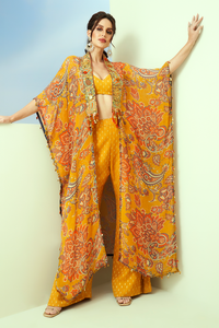 The Yellow Printed Collar Embellished Longline Kaftan with Bellbottom Pants and Bustier features a flowing silhouette adorned with intricate prints and embellishments around the collar, adding a touch of regal charm. The kaftan's length extends gracefully, offering both coverage and a dramatic flair. Paired with the kaftan are Bellbottom Pants, which complement its flowing silhouette with a dramatic flare from the knees downwards. To complete the ensemble, a Bustier is included, offering support and structure underneath the kaftan while enhancing the wearer's silhouette.