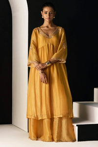 Featuring the Yellow Rehmat Lehenga Set, a hand-embroidered, relaxed-fit ensemble tailored in tissue silk. Complete with a matching dupatta included, this set exudes grace and festive elegance.