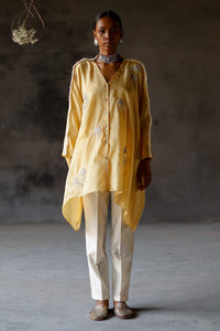 Featuring Yellow Roli Silk Kameez Set by Shikha Mehta from Paak Luxe Collection. Brighten up with this freesize yellow silk shirt, adorned with mirror embroidered floral motifs and ivory fringe details on the shoulders. Paired with ivory cotton silk pants, it offers a chic and comfortable look.