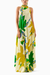 The Yellow Rose Halter Dress crafted from our stunning vegan silk fabrication has Embroidered Stone Collar. Made in our digitally printed Yellow rose print this is a trend setting piece. Featuring halter sleeves, this piece is versatile and easy to wear. It is floor length and has an easy to wear fit with a back hook. Pair it with heels for an elegant look.