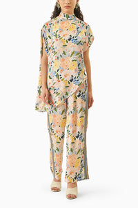 Yellow Blue Floral printed one shoulder slant top teamed up withstraight pants
