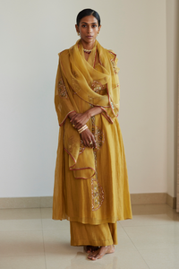 Featuring Yellow Shashi Stole by Sarang Kaur by Akaari Collection. Crafted by exquisite organza silk in a radiant yellow hue, this stole radiates elegance and charm. Perfect for adding a sophisticated touch to any outfit, ideal for both formal and casual settings.