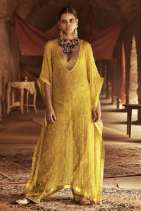 The Yellow Silk Organza Kaftan Set features a yellow kaftan in a silk organza base with crystal drop details, paired with a matching bralette and pants.