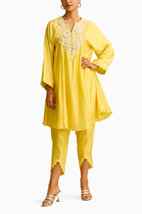 Featuring Yellow Silk Short Kurta with Tulip Pant by Ridhi Mehra from Love Rosetta Collection. Illuminate your style with this yellow silk flared short kurta, paired with tulip pants. The bright hue and elegant drape combine to create a vibrant, sophisticated look for any special occasion.