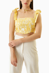 A floral embroidered corset features a pleated detailing at the bust with self tie shoulder straps. Boning throughout the midsection with a gold metal zip at the back for structured fit and is made from cotton fabric.