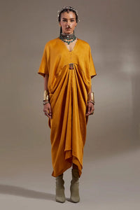 Featuring the Yellow Topaz Anka Zia Trapeze Dress by Aseem Kapoor’s ANKA collection. A solid textured drape dress with intricate embroidered tassels, designed for a relaxed, comfortable fit that flows effortlessly.