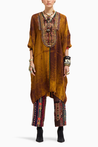 Featuring the Yellow Topaz Kuru Trapeze Tunic Set by Aseem Kapoor from Beyond Ken-3 Collection. This set features a Shibori print tunic with an embroidered yoke, tribal tassel detail, and seam inserts, paired perfectly with printed straight trousers. The tunic is adorned with Resham thread embroidery, cowrie shells, beads, and tassel details, exuding a blend of cultural charm and contemporary style. Offering an easy fit in a free-size tunic and comfort with elasticated waist trousers, this ensemble is ideal for effortless elegance and versatile wear.