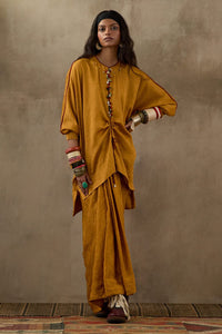 Featuring the Yellow Topaz Mural Kuru Trapeze Kurta with Skirt Set by Aseem Kapoor from the Mural Collection. This set includes a textured solid-colored short trapeze kurti with tribal tassel details, paired with a textured pleated skirt. Made from crushed silk, the kurta offers a free-size anti-fit, while the skirt features an elasticated waist for a relaxed fit. Slight variation in print may occur.