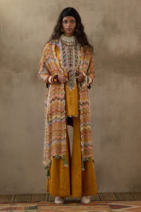 Featuring the Yellow Topaz Mural Mitra Short Kurta with Flare Trouser and Dupatta by Aseem Kapoor from the Mural Collection. This set includes a textured solid-colored short kurti with inserts, paired with sharara trousers and a chevron printed sheer silk dupatta. Adorned with resham thread embroidery, cowri shells, M.O.P. beads, and tassel details, the kurti and trousers are made from crushed silk, offering a relaxed fit with an elasticated waist. *Slight variation in print may occur.*