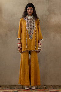 Featuring the Yellow Topaz Mural Mitra Short Kurta with Flare Trouser Set by Aseem Kapoor from the Mural Collection. This set includes a textured solid-colored short kurti with inserts, paired with textured sharara trousers. Adorned with resham thread embroidery, cowri shells, M.O.P. beads, and tassel details, the kurta offers a relaxed fit, and the trousers feature an elasticated waist for comfort. *Slight variation in print may occur.*