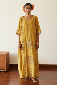 Featuring Yellow Uday Kaftaan by Sarang Kaur by Akaari Collection. This vibrant ensemble pairs a Chanderi silk kaftaan with a cotton undershirt in sunny yellow. Perfect for relaxed yet stylish wear, it offers a blend of comfort and contemporary elegance.