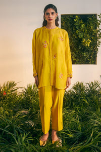 Featuring Zia Co-ord Set by Shikha Mehta from Baagh Collection. This yellow chanderi top adorns delicate thread embroidery and a loose fit for effortless style. It pairs beautifully with silk chanderi cigarette pants and a short cotton slip, combining luxurious fabric with a relaxed, elegant design.