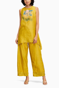 The Yellow Zinnia Embellished Kurta Top features exquisite embellishments and delicate embroidery, exuding elegance and sophistication. It is paired with appliqu side panel pants in Chanderi, creating a refined and balanced ensemble that perfectly combines traditional craftsmanship with modern design.