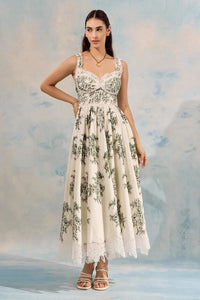 Featuring a sweetheart neckline with scalloped lace trim, this corset-style midi dress offers a fitted bodice, flared skirt, and lace-trimmed straps. Delicate green embroidery and lace edging enhance its romantic charm, while a smocked back ensures a comfortable fit.