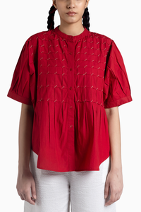 Yoshi, a red poplin shirt featuring sculpted beige pleats.