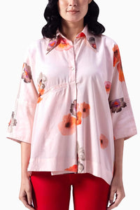 Yugenis a soft pink cotton satin top featuring an Ella print, with pintuckdetailing on sleeves and cuff, glass bead embellishments on the collar, placket, and sleeve openings, and a welted pocket detail.