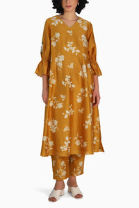 Featuring the ochre Tunic in yuri print silk chanderi, paired with the matching pants, embodies an exquisite blend of elegance and sophistication. This ensemble is a timeless addition to any wardrobe, offering a perfect balance of traditional craftsmanship and contemporary design.