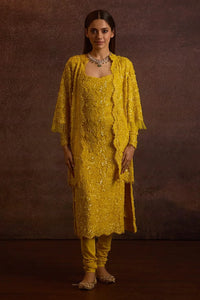 Featuring Zahavi Yellow Kurta Set by The House of Exotique's Nagma Collection. The fully embellished open jacket features bell sleeves with tassels and a round neck for a touch of drama. The long straight kurta is also fully embellished, with side seam zipper fastenings and full sleeves for a refined look. Paired with a stretch net churidar with an elasticated waist for comfort and style. Crafted from Chantilly lace and power mesh in a vibrant yellow, this set combines elegance with bold flair.