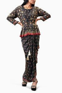The Black Zahra Printed Drape Dress with an Embellished Peplum Jacket in Cotton Silk offers a perfect balance of modern chic and timeless elegance. The printed drape dress flows gracefully, while the embellished peplum jacket adds a sophisticated, glamorous touch. Crafted in luxurious cotton silk, this ensemble is ideal for evening events or special occasions, combining comfort with high-fashion appeal.