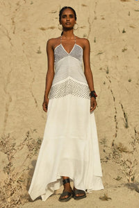 The Zaire Dress is a garment that flows, much like its namesake, the African river Zaire. The dress shows off dainty, abstract hand-embroidery that embellishes its upper half. It has a minimalist beaded neckline. The garment is a classic A-line dress that, when worn, makes you feel thoroughly at ease. This is a dress for all occasions.