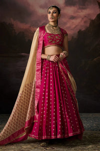 Featuring the Zara Rani Pink Skirt from Swatti Kapoor’s Firdaus collection. This skirt is crafted from Banarasi Chanderi Brocade and Handwoven Chanderi Zari Stripe fabric, lined with 100% cotton and detailed with exquisite hand-embroidered fringing.