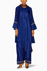 Featuring a kurta set with zardosi motifs on the pockets as well on the border of the salwar and sleeves paired with an organza brown dupatta. Crafted from sumptuous silk, the kurta boasts a smooth and lustrous texture that drapes elegantly over the body, offering both comfort and style.