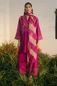 Featuring Zaria Kurta Set by Shikha Mehta from Baagh Collection. This wine silk chanderi kurta, showcasing thread embroidery and a drop shoulder design, pairs beautifully with a short cotton slip and a vibrant leheriya silk organza dupatta. The ensemble combines elegance with a touch of traditional flair.