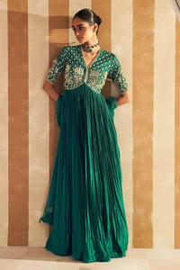 Indulge in opulence with our Emerald Anarkali Set, a mesmerizing blend of traditional charm and contemporary flair. The V Neck is adorned with luxurious Gold embroidery, enriched further with vibrant multi-color threadwork showcasing a harmonious fusion of floral motifs. Adding to its allure, the long sleeves feature heavy big florals at the end, while small floral motifs delicately adorn the sleeves, creating a captivating visual contrast. The ensemble is elevated with beautiful emerald green hangings around the neckline, adding a touch of regal elegance. Step into the spotlight with this exquisite Anarkali Set, designed to make every moment memorable with its timeless beauty and enchanting details.