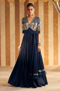 Indulge in opulence with our Navy Anarkali Set, a mesmerizing blend of traditional charm and contemporary flair. The V Neck is adorned with luxurious Gold embroidery, enriched further with vibrant multi-color threadwork showcasing a harmonious fusion of floral motifs. Adding to its allure, the long sleeves feature heavy big florals at the end, while small floral motifs delicately adorn the sleeves, creating a captivating visual contrast. The ensemble is elevated with beautiful emerald green hangings around the neckline, adding a touch of regal elegance. Step into the spotlight with this exquisite Anarkali Set, designed to make every moment memorable with its timeless beauty and enchanting details.